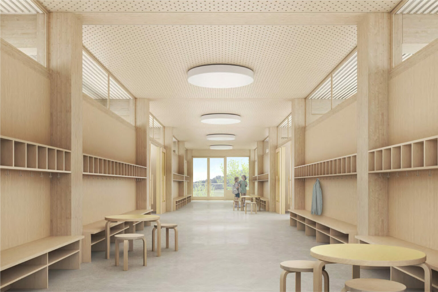 Oblichtbänder sowie Verglasungen zu den Klassenzimmern und grosse Fenster am Ende des Korridors bringen Licht in die mittige Erschliessungszone die Platz für die Garderoben und Aufenthalt bietet. © Atelier Amot
