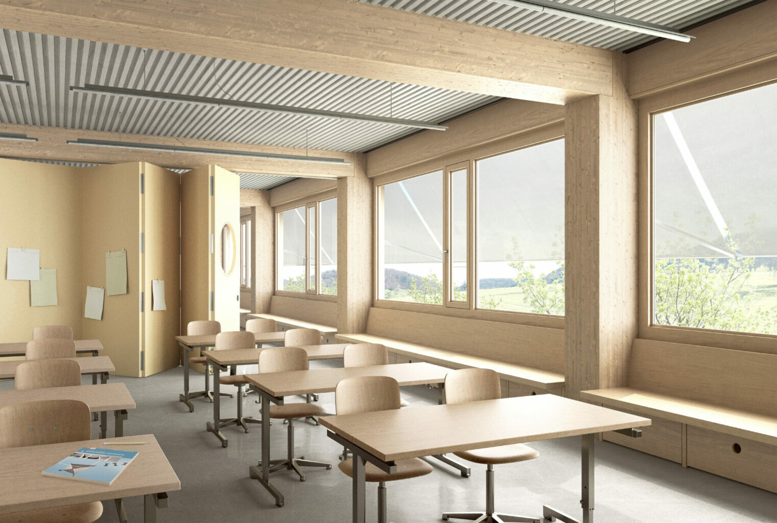 Klassenzimmer im Campus Loggia mit Falttrennwand zu den Gruppenräumen. © Atelier Amot