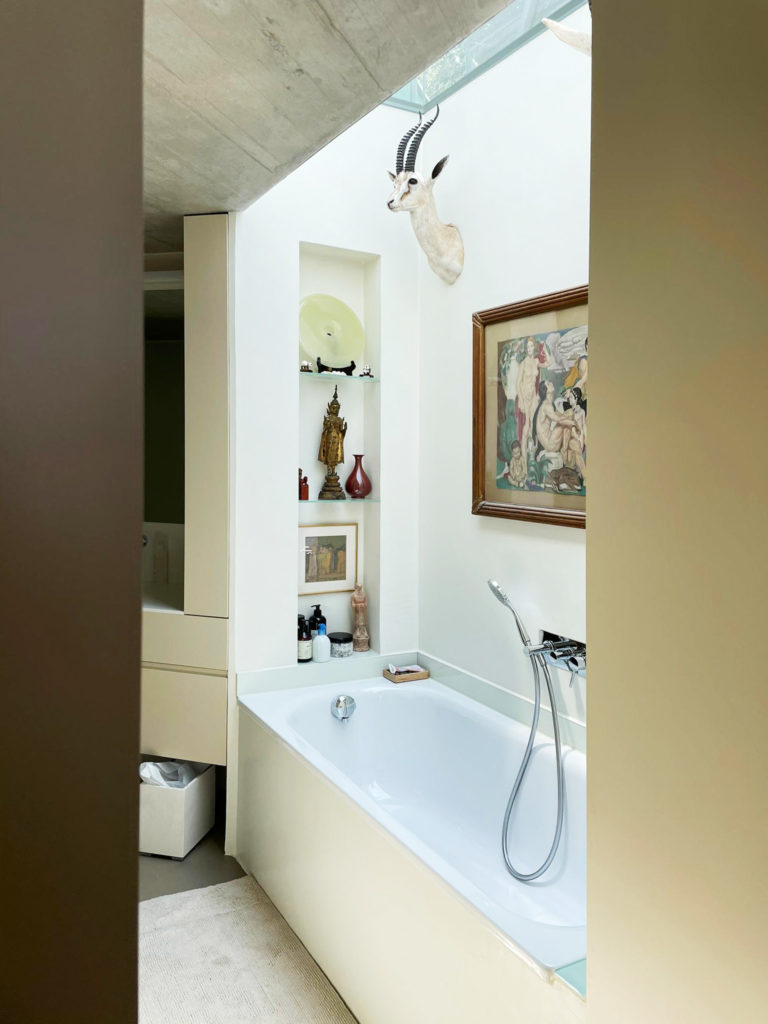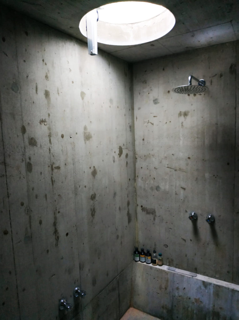 Hier findet sich Duschen und Baden für brutalistische Puristen: Beton dominiert im Bad. Das Oberlicht schafft dank zenitalem Licht eine fast schon sakrale Atmosphäre.