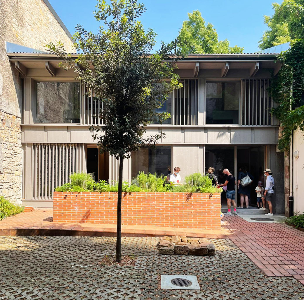 Szenenwechsel: Unser nächstes Highlight erwartet uns im Kleinbasler Hinterhof. Hier haben Alma Maki mit viel Liebe zum Detail und handwerklichem Geschick ein besonderes Atelierhaus erbaut. Der schattige, mineralisch geprägte Hof empfängt die BesucherInnen und lädt zum Verweilen ein. In Ruhe kann die fein gegliederte Fassade analysiert werden.