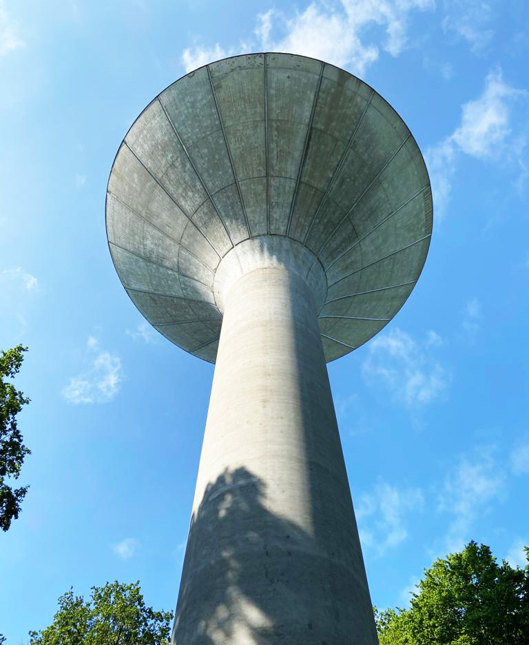"Allschwil tower is calling!" Wir beenden unsere Tour beim 1973 erstellten Allschwiler Wasserturm. Der 42,5 Meter hohe Turm ist mit 18 Meter langen Betonpfählen im Lössboden gegründet. Er enthält zwei Reservoire mit insgesamt 990 Kubikmeter Trinkwasser, davon 100 Kubikmeter Löschwasserreserve.