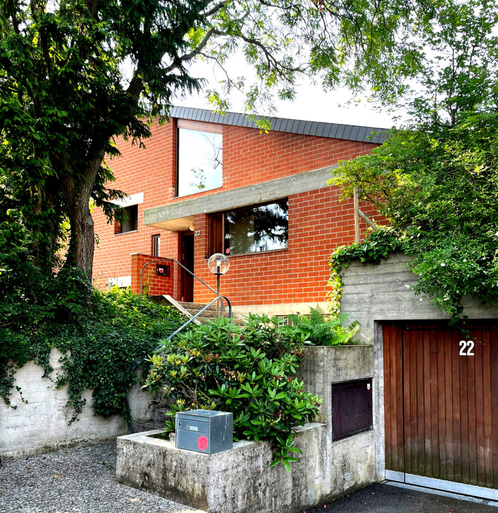 Wir beginnen unsere Tour am beschaulichen Pappelweg in Muttenz. Erwartet werden wir von rotem Backstein, Stürzen in brettergeschaltem Sichtbeton und einem markanten Giebeldach. Zeittypisch: Der Bestand stammt von Burckhardt Architekten aus dem Jahr 1969.