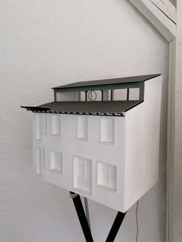 Das "Haus im Hof" macht auch im Modell eine gute Figur... Das Konzept der Aufstockung ist clever: Unter Beibehaltung der First- und Trauflinien wurde das Dach in der Mitte aufgeklappt um mehr Höhe und ein neues Fensterband zu erhalten.