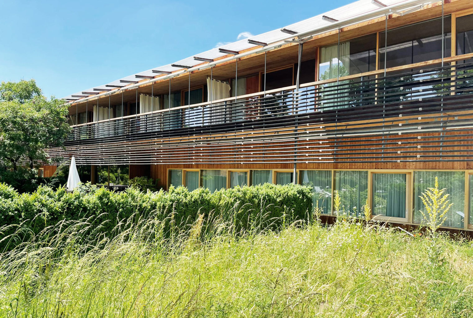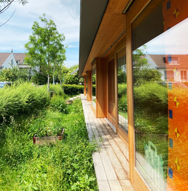 Das Grün rund um den Kindergarten gedeiht, wächst und macht den Bezug zwischen Innen- und Aussenraum intensiver erlebbar. Die Laube als Schwellenraum leistet dabei einen wesentlichen Beitrag. Einfach schön.