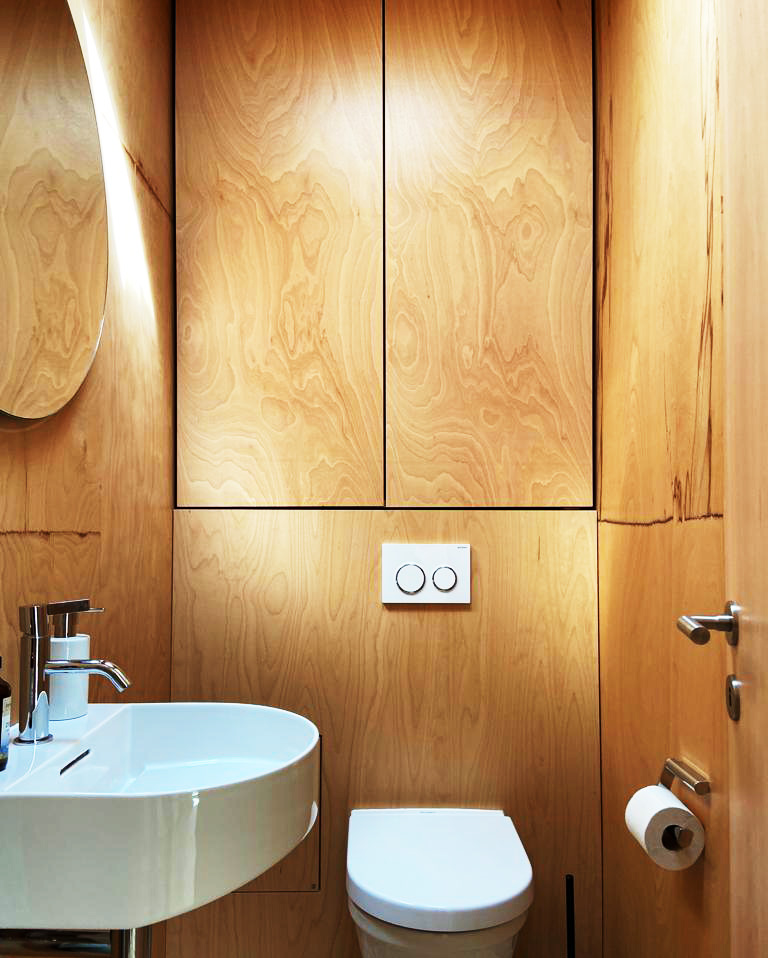 Das Open House offenbart auch intime Einblicke: Auf dem stillen Örtchen im "Movable house" prägt das Buchenschichtholz, das in den Zwischenwänden eine tragende Funktion übernimmt, den Raum. Struktur und Innenausbauten funktionieren symbiotisch. Ein Haus wie ein Möbel oder – ein Möbel wie ein Haus?