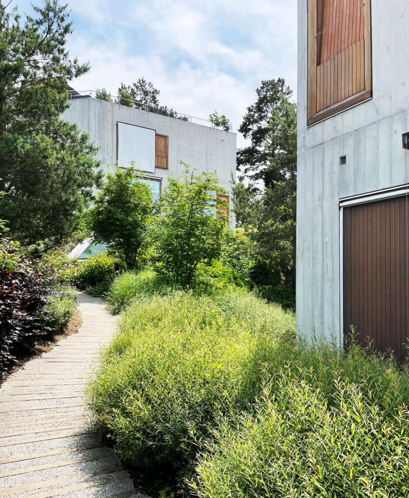 Wie wichtig Landschaftsarchitektur sein kann, beweisen die beiden Doppeleinfamilienhäuser von Staehelin Meyer Architekten am Rütiring in Riehen. Die gepflegt-wilde Vegetation verleiht den beiden Betonkörpern Kraft und räumliche Präsenz. Besonders gelungen ist die feine Gestaltung der Zugangswege.