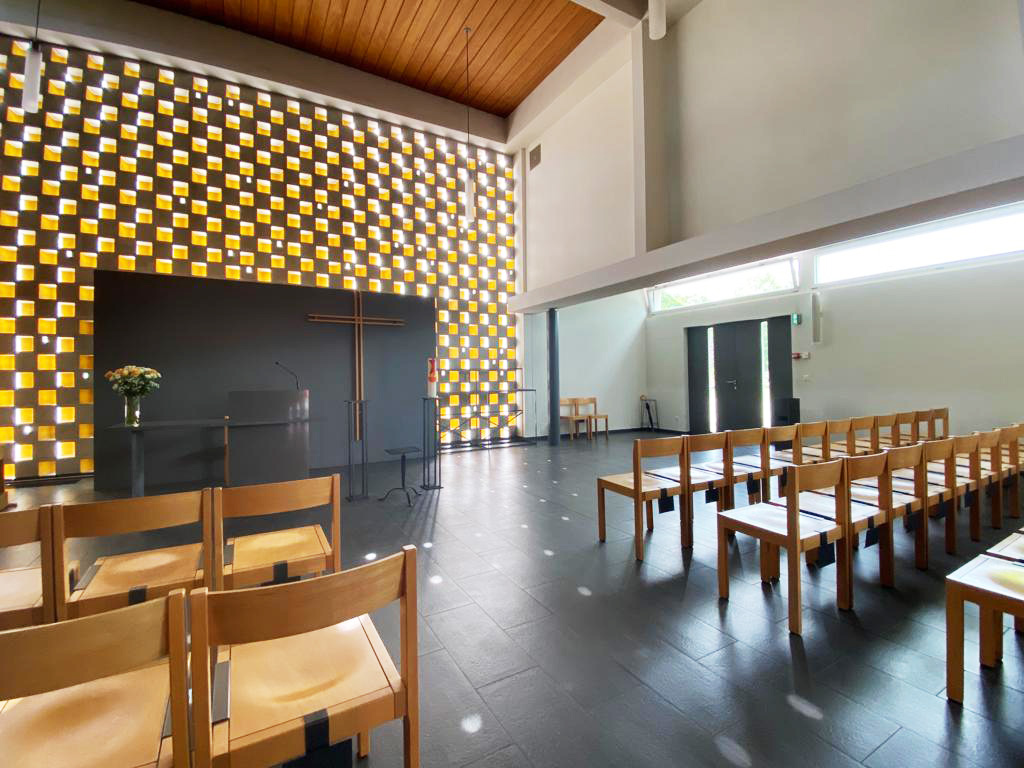 Abdankung im Licht- und Schattenspiel: Das rhythmisch geöffnete Mauerwerk hinter dem Altar schafft trotz aller Andacht eine lebendige, hoffnungsvolle Stimmung. Toll, dass am Open House auch solch wenig bekannten Bauten ihre Pforten öffnen, wobei der Publikumsandrang hier eher bescheiden war. Leider.