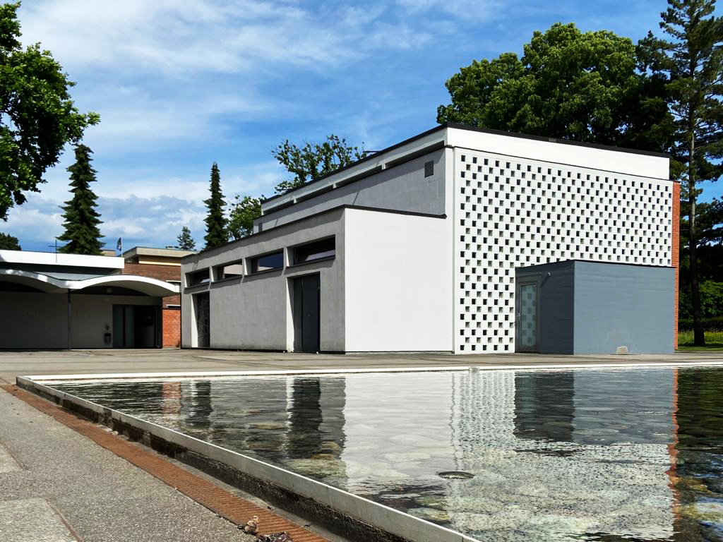 A propos sakral: Nicht weit entfernt haben die beiden Architekten Walter Wurster und Hans Ulrich Huggel im Jahre 1956 eine sehenswerte Friedhofskapelle erbaut. Architektur der Nachkriegsmoderne wird hier in ihrer besten Form dargeboten. Das Wasserbecken spiegelt die stimmige Anlage. Eine Entdeckung!