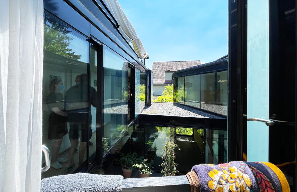 Im Obergeschoss eröffnen sich über den Hof zahlreiche Ein- und Ausblicke, wobei der Hof als zentrales räumliches Element verbindend wirkt. Der Dank gebührt der Eigentümerschaft, die der Öffentlichkeit den Besuch dieser Architekturikone ermöglichte. An dieser Stelle der Wunsch unserer Redaktion für das nächste Jahr: Wie wäre es, wenn das "Haus an der Brandwand" seine Türen für ein Wochenende öffnen würde? Träumen ist erlaubt... "Jacques, was meinsch?"