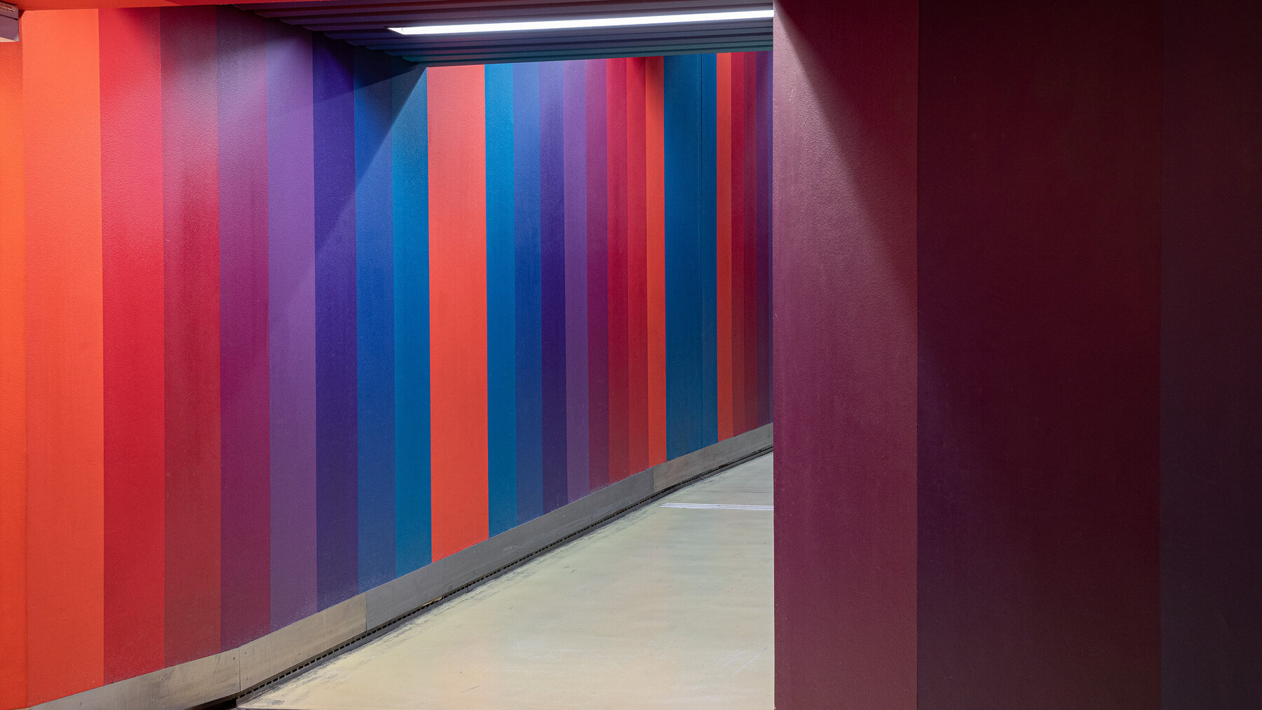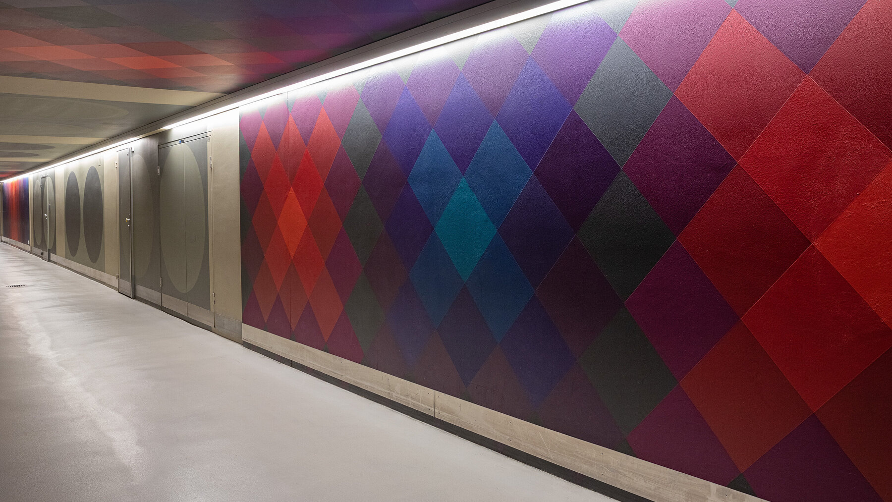 Der weltbekannte und zeitweise in Basel wohnhafte Architekt und Designer Verner Panton (1926-1998) hat im Auftrag des Kantons den langen Verbindungsgang vom Klinikum II zum Parking im Kantonsspital künstlerisch gestaltet. Damit wollte man dem monotonen und etwas unheimlichen Charakter des hundert Meter langen, fensterlosen Gangs entgegenwirken. Panton gliederte seine Arbeit in acht Sequenzen in den acht Spektralfarben Orange, Hellrot, Dunkelrot, Aubergine, Lila, Violett, Blau und Türkis. Unterbrochen werden dies Sequenzen durch wenige Abschnitte in Grautönen, bei denen sich das Auge etwas ausruhen kann. Die Bemalung wurde im All-Over-Verfahren vorgenommen, ohne Unterscheidung zwischen Boden, Wänden und Decken. Seit seiner Entstehung wurde das begehbare Kunstwerk mehrfach verändert, so in der Farbe des Bodens, durch den Ersatz der originalen Beleuchtung und durch das Anbringen von Werbepostern. Die Bemalung ist aber vollständig erhalten und in erstaunlich gutem Zustand.
