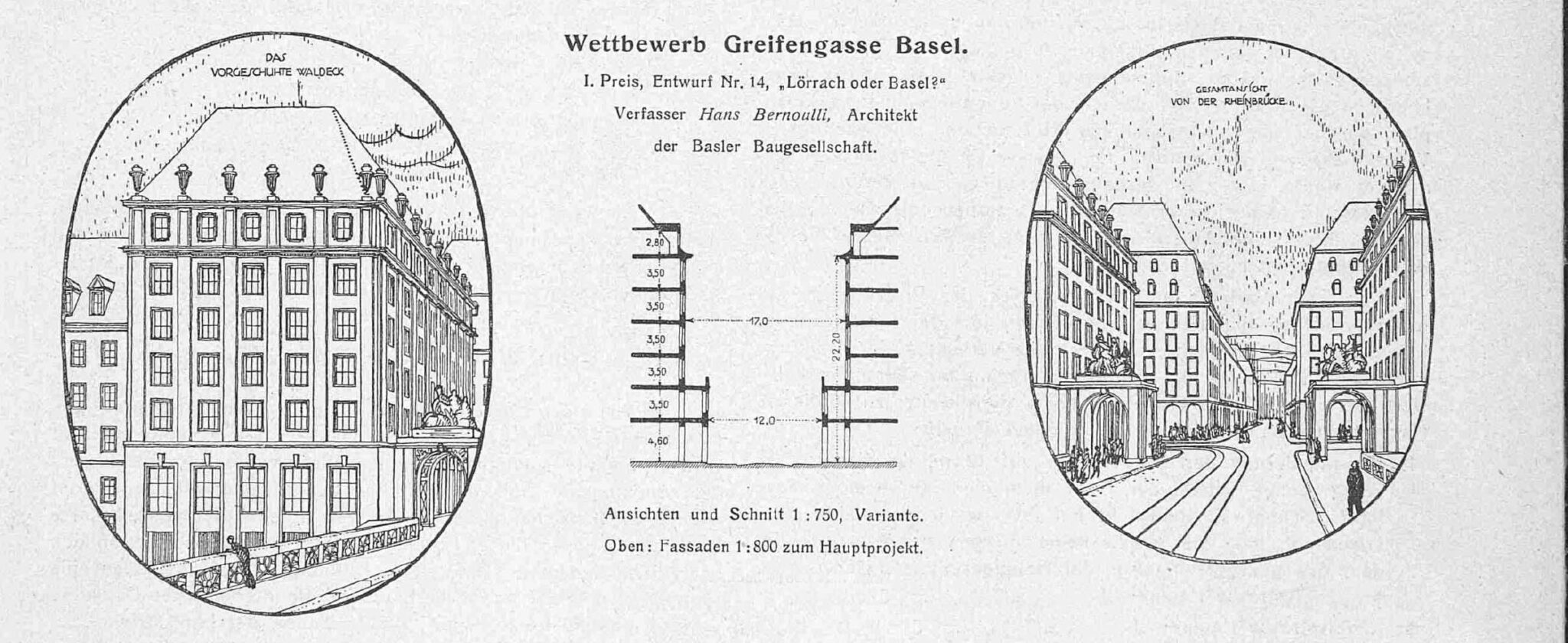 Wettbewerbsbeitrag von Hans Bernoulli für die Greifengasse um 1918.
