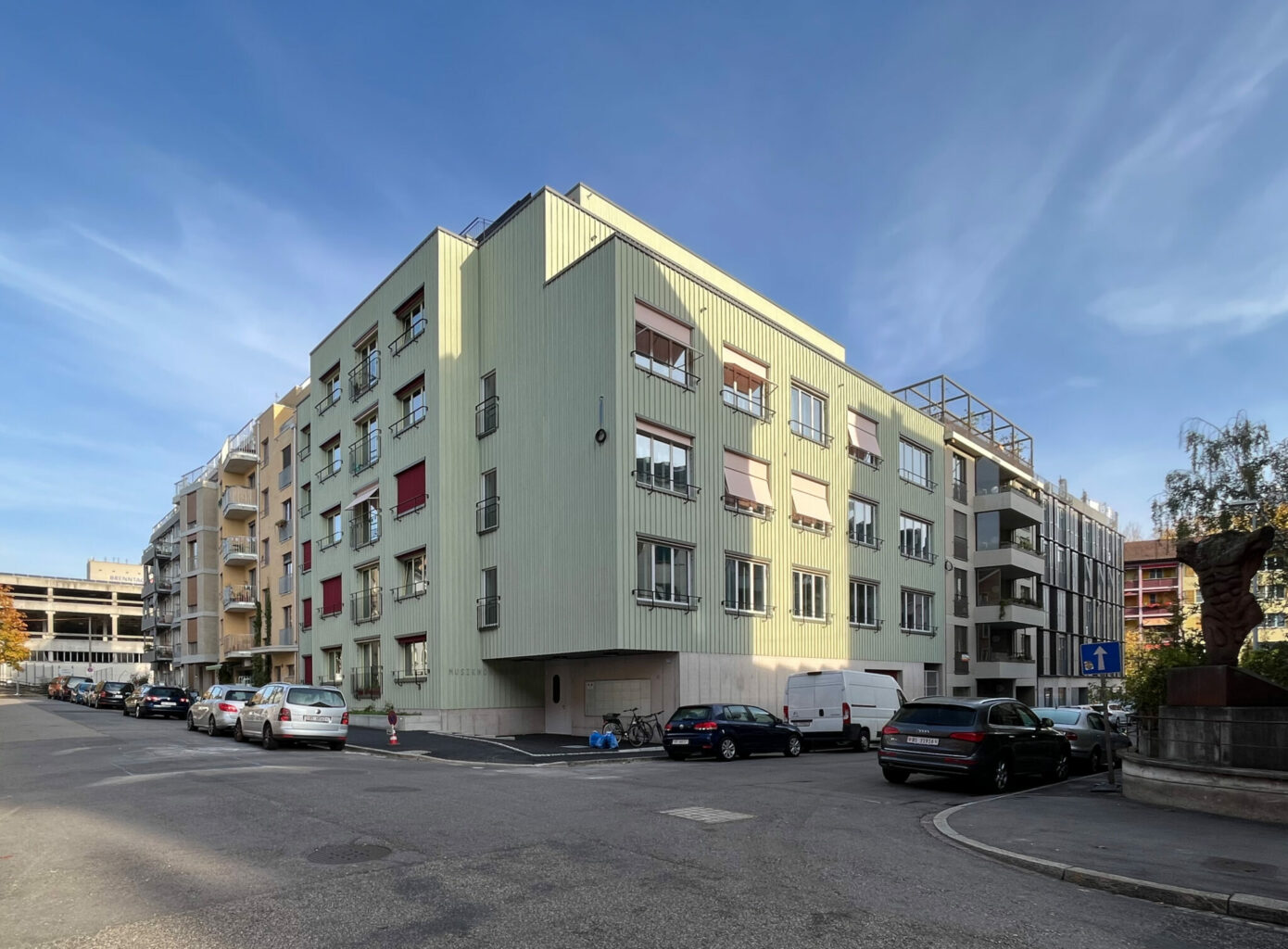 Strassenecke Lothringerstrasse / Beckenstrasse – vom Welleternit, Klinker zum Putz über Holz bis zum Sichtbeton – Es wird eine grosse Material- und Farbenvielfalt geboten © Architektur Basel