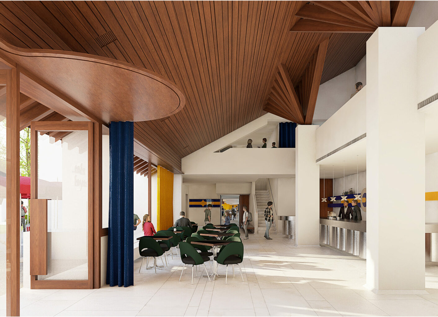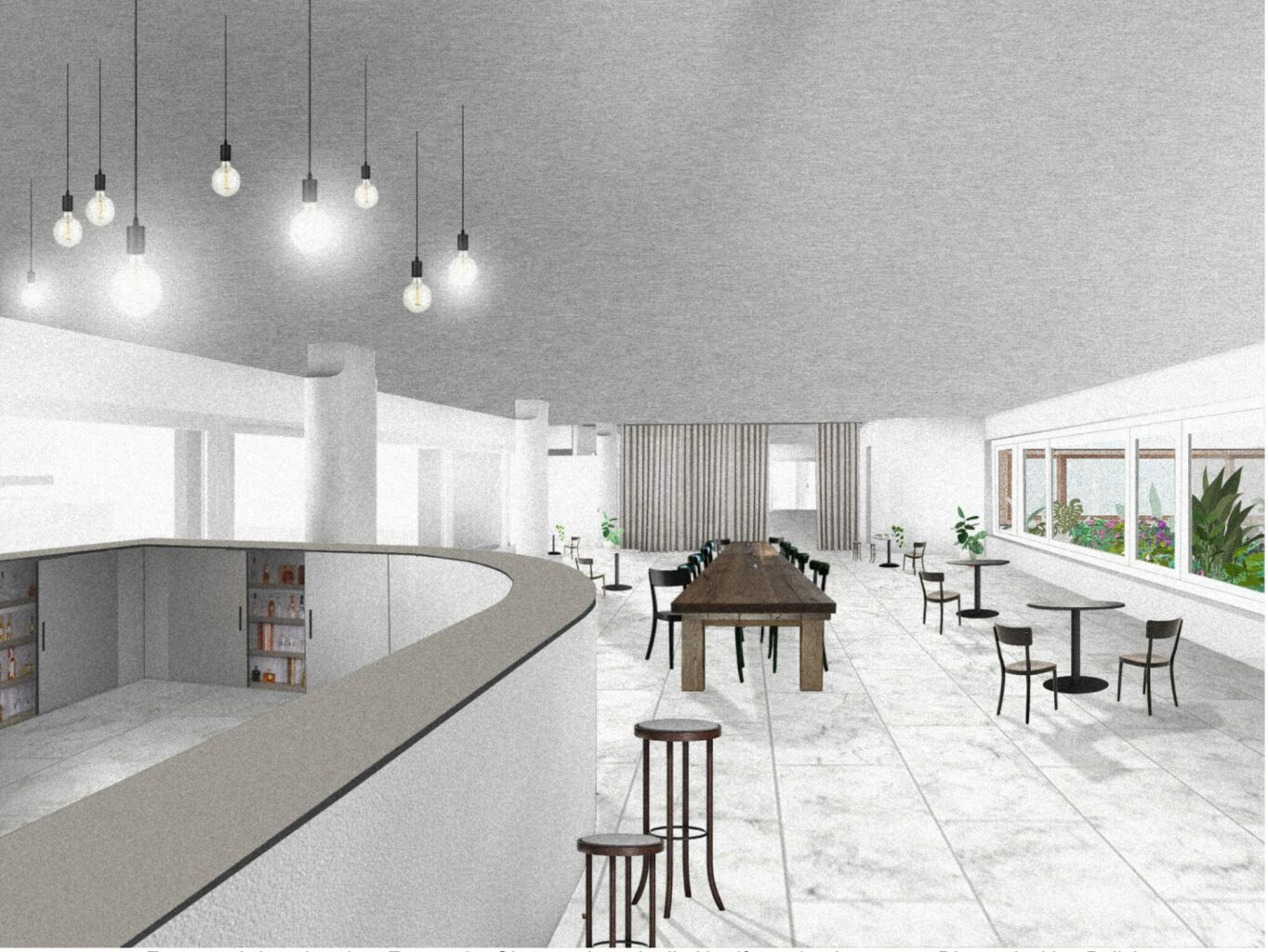 Die Umnutzung des Restaurants in die kleinteiligeren Räume der Musik- schule wären lediglich für die Musikschule ein grosser Gewinn. Das vorgeschlagene Restaurant im Bereich des heutigen Foyers und der Galerie hat nur wenig Tageslicht, ist auf zwei Ebenen betrieblich ressourcenintensiv und kann keine grösseren Gruppen beherbergen. Ein kommerzieller Betrieb wäre kaum denkbar. Der Einbau eines grossen Fensters in der platzgewandten Wand wirkt in der äusseren Erscheinung wenig harmonisch.
