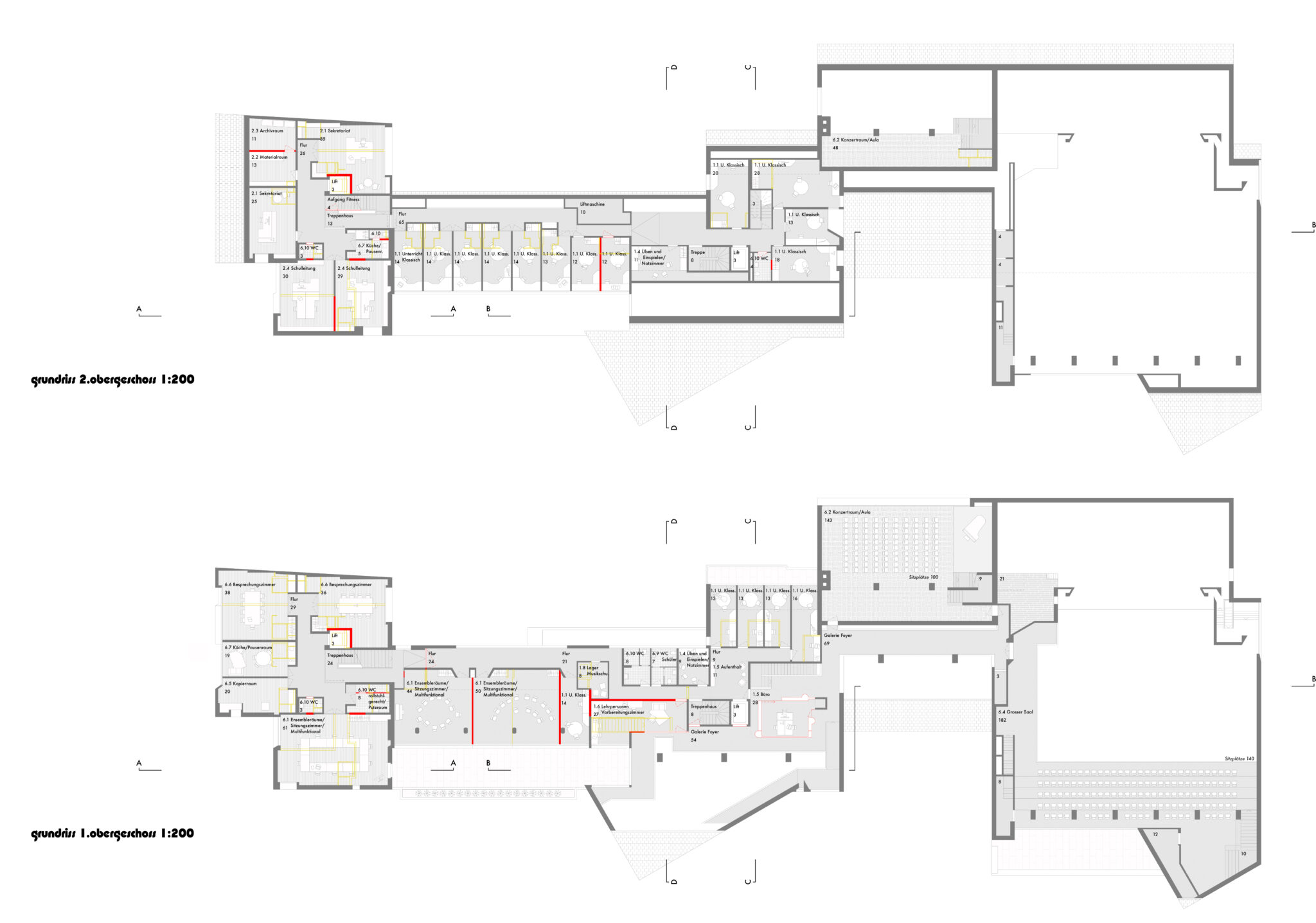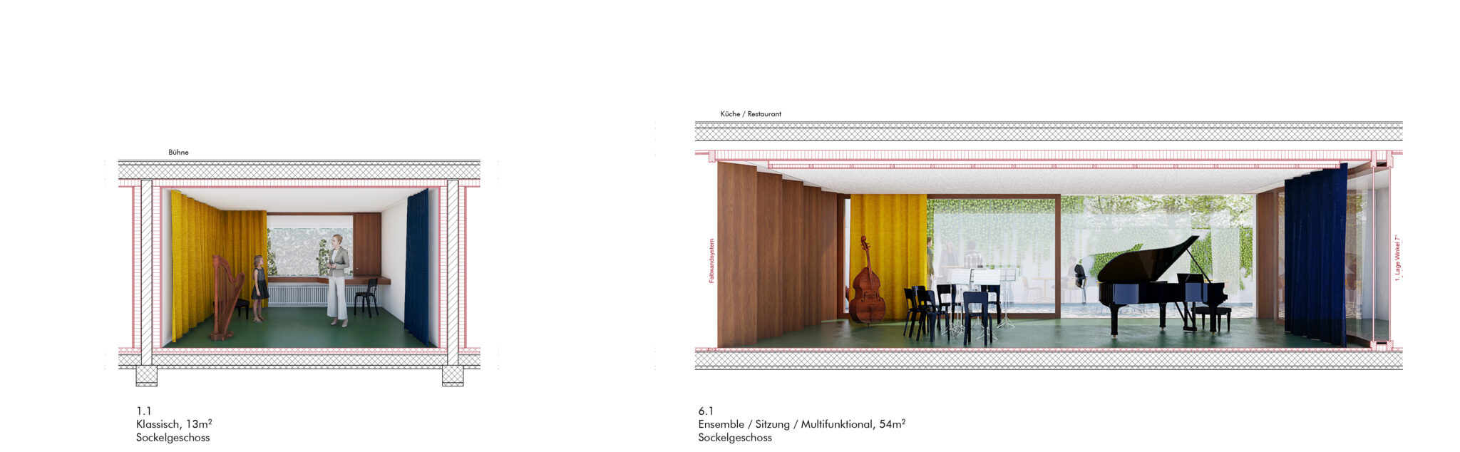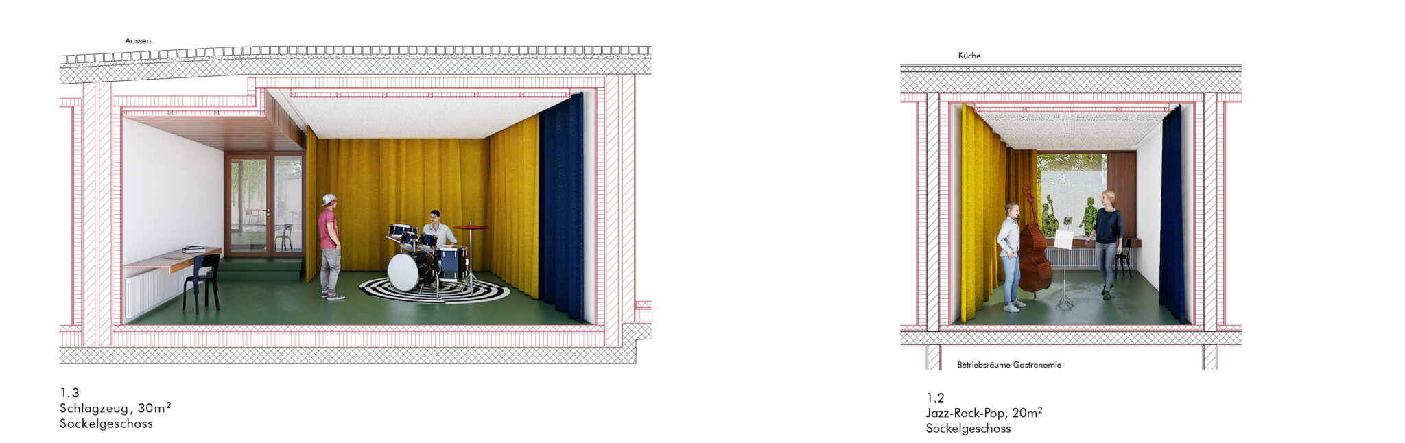 Das Thema Akustik der neuen Musikräume wird ernst genommen und Prinzipienschnitte zu den wichtigsten Räumen erarbeitet. Dennoch, die schlauchförmigen Raumproportionen der Übungsräume «Klassisch» und die niedrigen Raumhöhen in der Aula im 1. OG können nicht überzeugen. Positiv werden sowohl der im Erdgeschoss angeordnete Empfang der Mu- sikschule wie die Lage und Ausgestaltung des multifunktionalen Musik- raumes beim abgesenkten Innenhof im Untergeschoss bewertet.