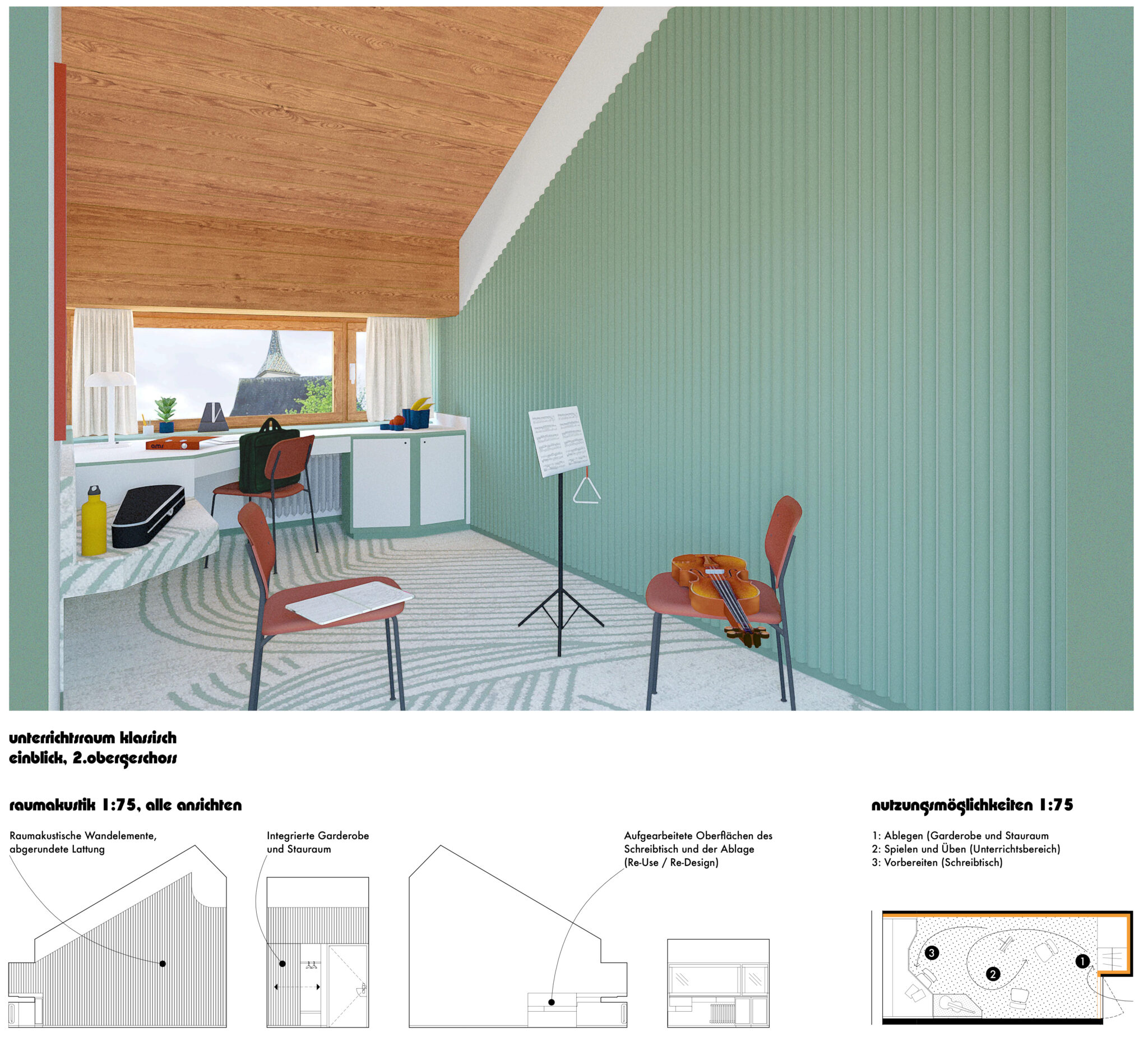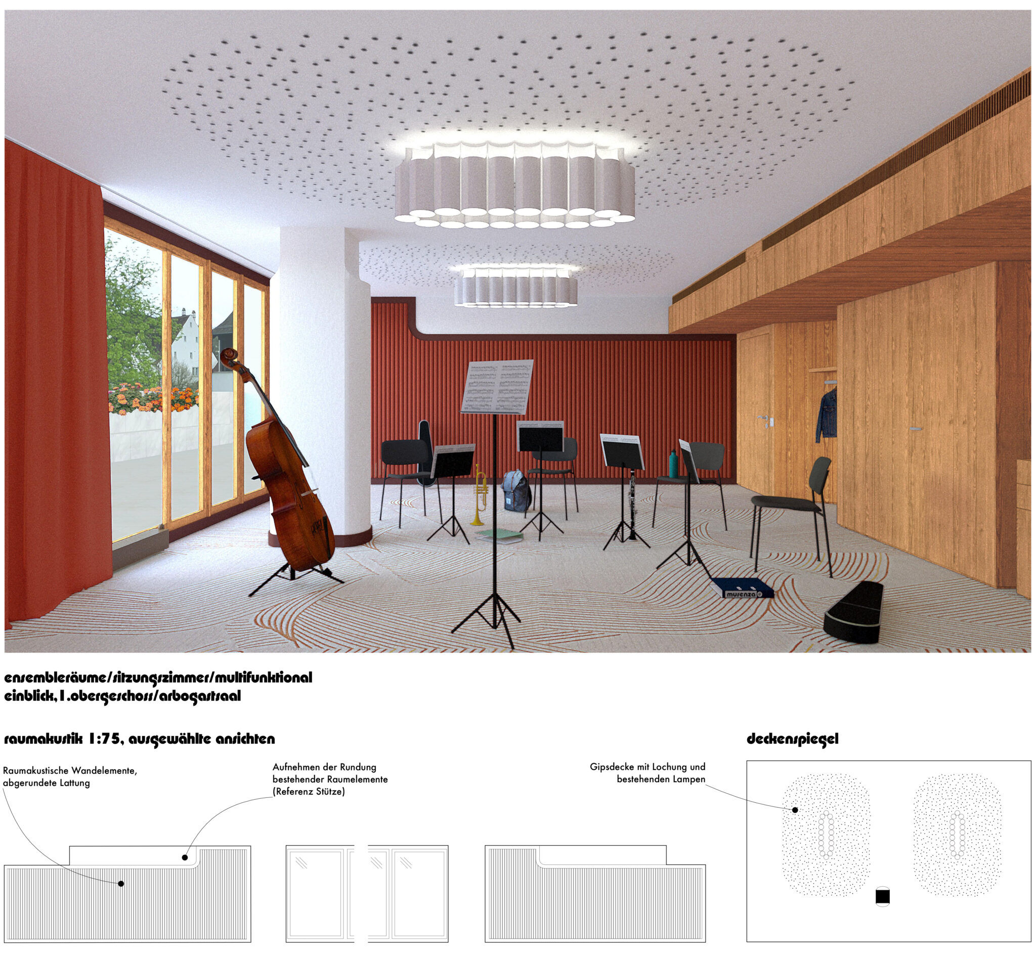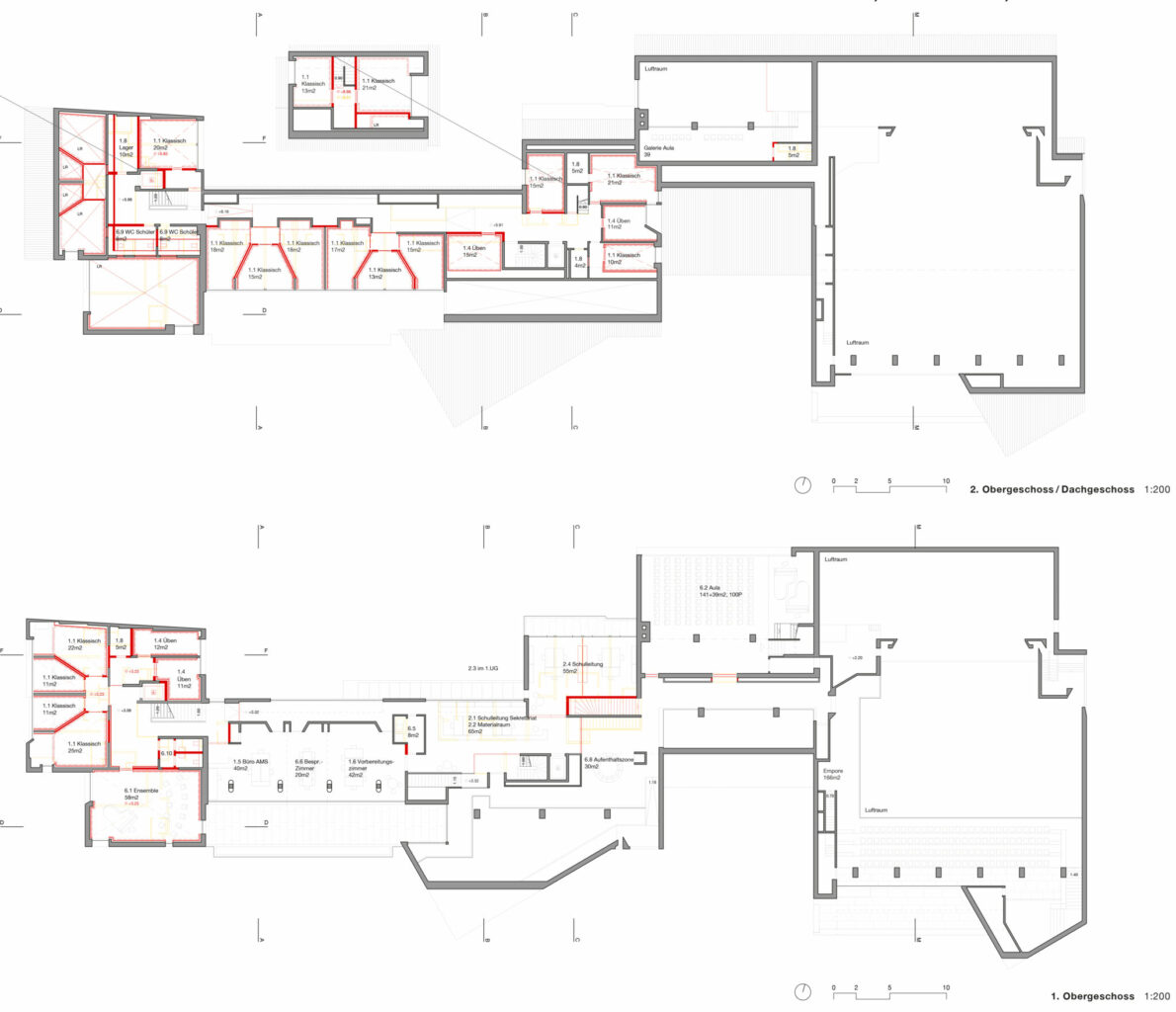 Das Thema Akustik der neuen Musikräume wird ernst genommen und Prinzipienschnitte zu den wichtigsten Räumen erarbeitet. Dennoch, die schlauchförmigen Raumproportionen der Übungsräume «Klassisch» und die niedrigen Raumhöhen in der Aula im 1. OG können nicht überzeugen. Positiv werden sowohl der im Erdgeschoss angeordnete Empfang der Mu- sikschule wie die Lage und Ausgestaltung des multifunktionalen Musik- raumes beim abgesenkten Innenhof im Untergeschoss bewertet.