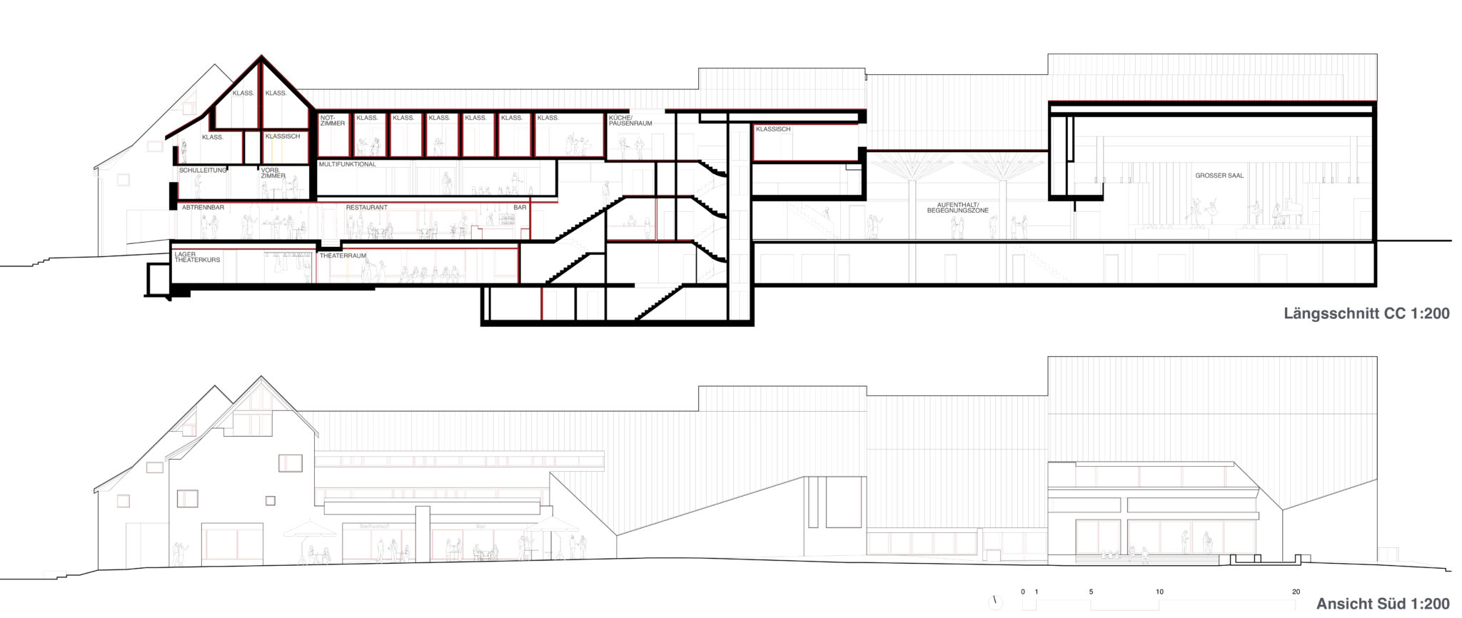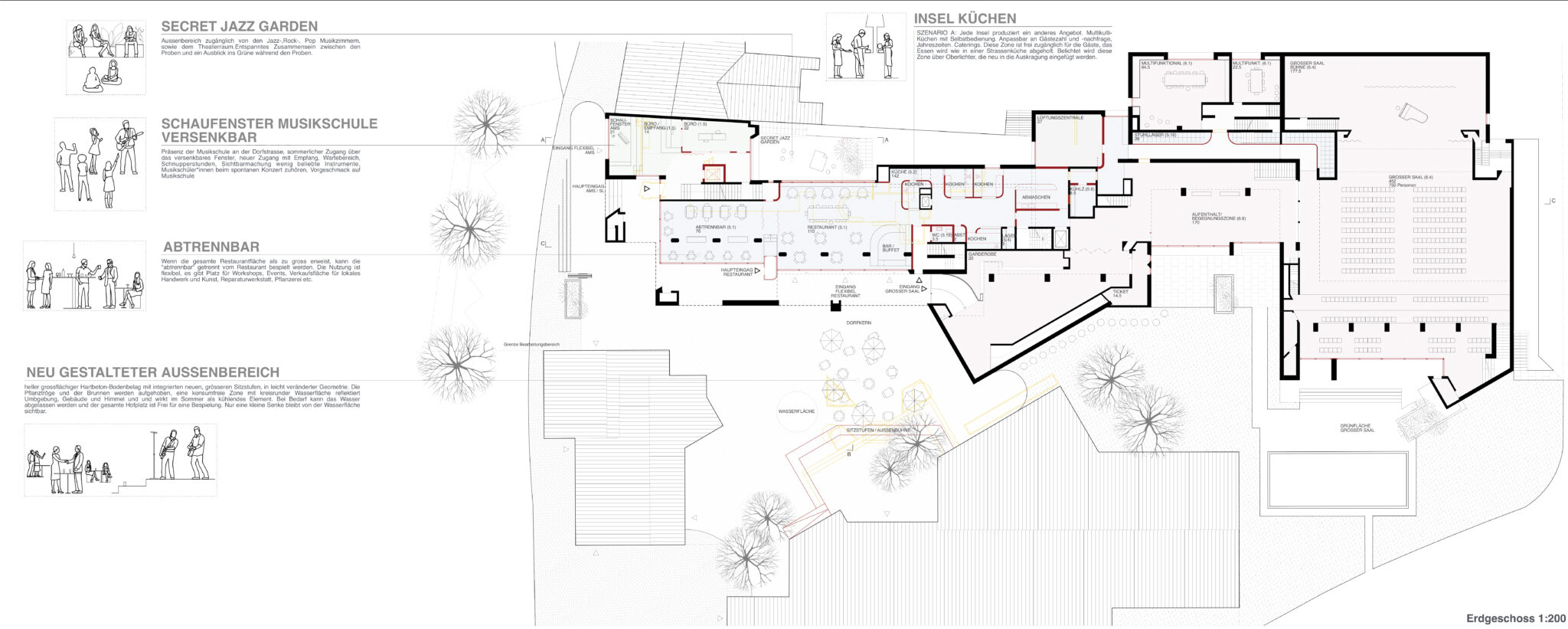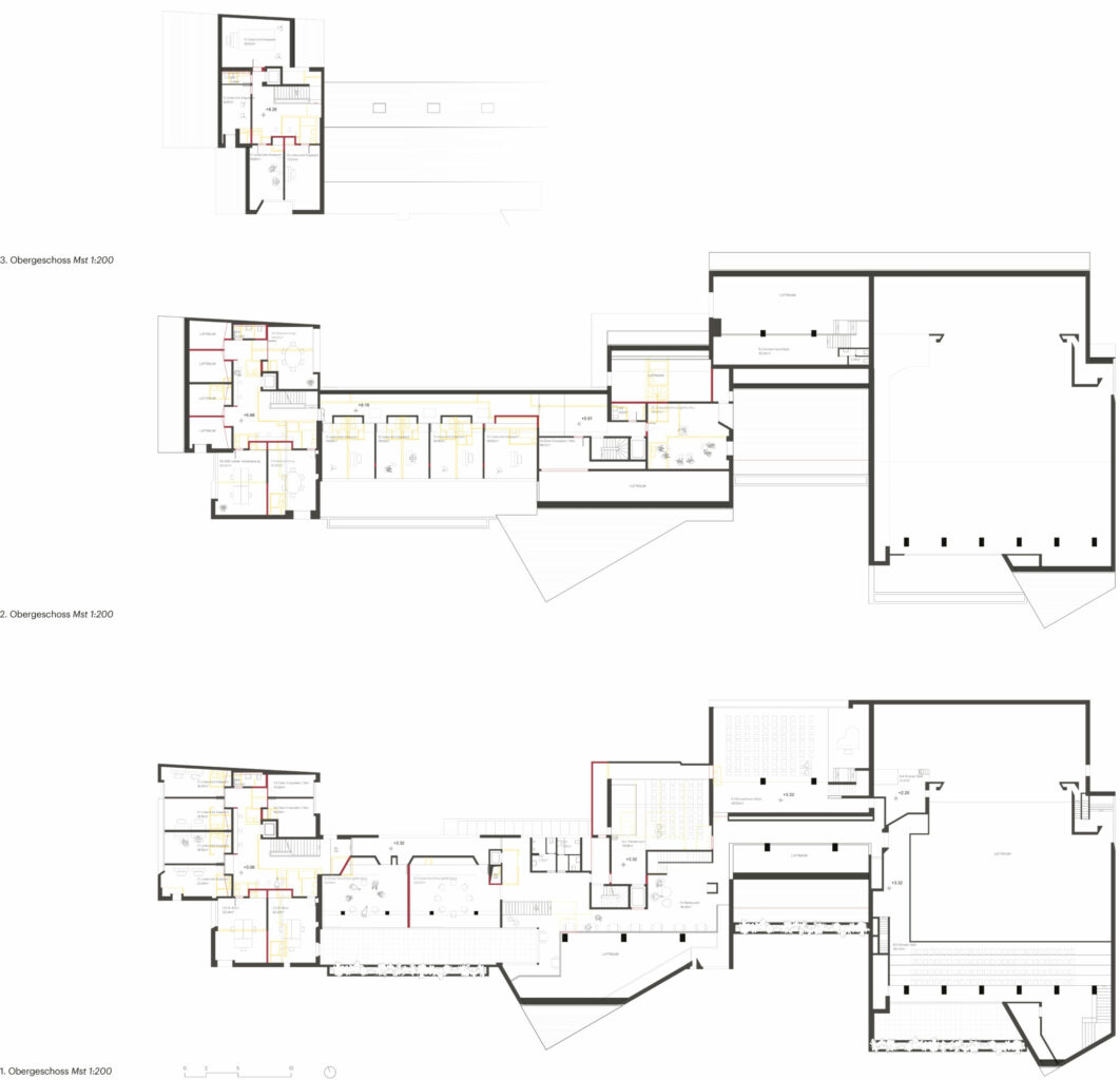 Mit zwei Entwurfsentscheidungen können Buol & Zünd den selektiven Wettbewerb gewinnen. Zum einen legen sie den Eingang der Musikschule ins schwierig zu bespielende, üppige Foyer des Saals und aktivieren somit den verlassenen Innenhof als auch das Foyer. Zudem schaffen sie eine geschickte Verteilung des Raumprogramms, das zu wenig Eingriffen und zu einer klaren Trennung der Funktionen führt – mit dem Motto, oben leise, unten laut. Vergleicht man das Siegerprojekt mit den anderen Beiträgen, so fällt ins Auge mit wie wenig rot-gelben Teilen auf den Plänen es auskommt. Dies ist nicht nur der geschickten Verteilung zu verdanken, sondern zeigt eine grundlegend andere Lesart des Bestands. Es stellt sich dabei die Frage, ist dies wirklich bloss eine Ermessensfrage? Die Beiträge der Büros Back Simonsen und Beer Merz zeigen eine akribische Analyse und viel Freude in der Auseinandersetzung mit der Substanz. Während beide diese im denkmalpflegerischen Sinne aufzufrischen versuchen und gleichzeitig um alle aktuellen Normen und Auflagen bemüht sind, zeigt sich der Beitrag von Buol & Zünd da etwas flapsig und verweist in vielen Punkten einfach auf den Bestandsschutz. Zudem versuchen die anderen Teilnehmer mit verschiedenen Intentionen die bestehende Anlage zu beleben: Es finden sich beispielsweise neue Restaurantkonzepte, Verbesserungsvorschläge für die Erschliessung, Aufwertungen in der Aussenraumgestaltung oder neue Schaufenster zum Dorf. Ist dies alles gar nicht von Nöten?