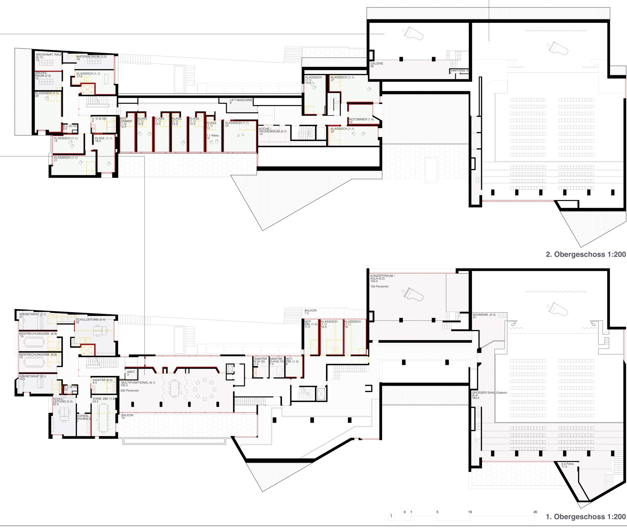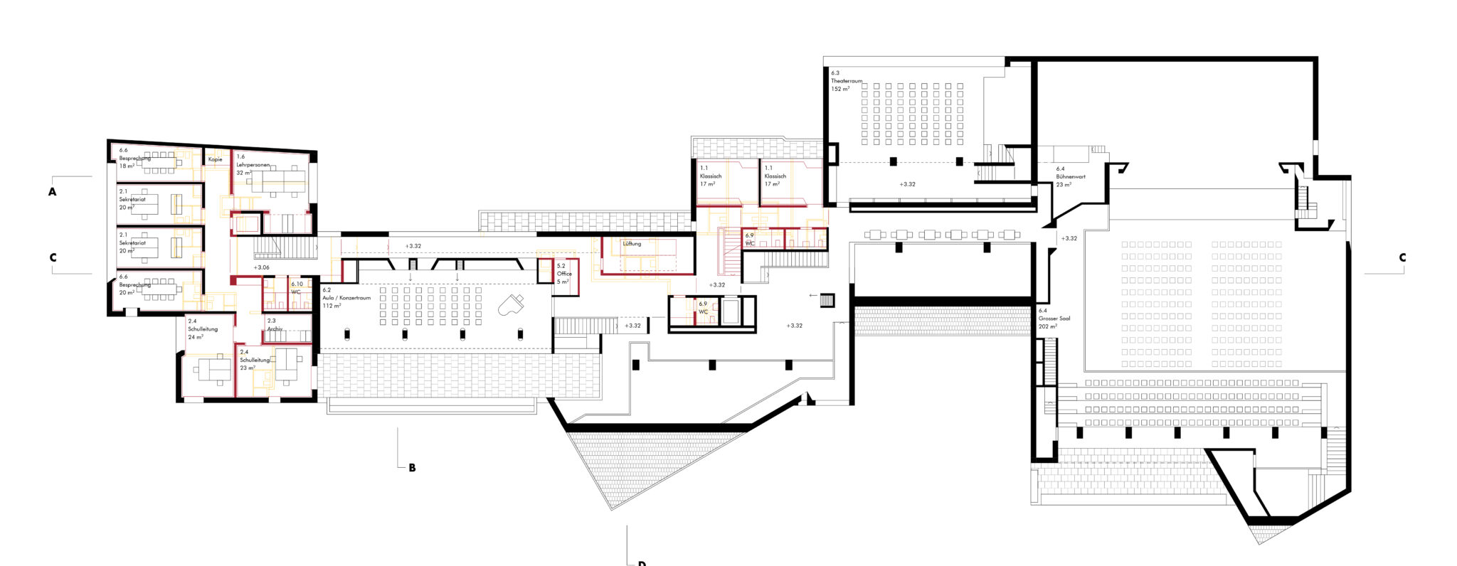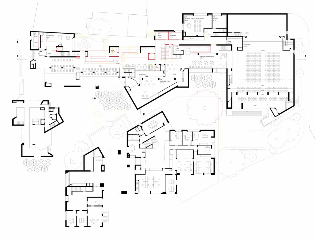Mit zwei Entwurfsentscheidungen können Buol & Zünd den selektiven Wettbewerb gewinnen. Zum einen legen sie den Eingang der Musikschule ins schwierig zu bespielende, üppige Foyer des Saals und aktivieren somit den verlassenen Innenhof als auch das Foyer. Zudem schaffen sie eine geschickte Verteilung des Raumprogramms, das zu wenig Eingriffen und zu einer klaren Trennung der Funktionen führt – mit dem Motto, oben leise, unten laut. Vergleicht man das Siegerprojekt mit den anderen Beiträgen, so fällt ins Auge mit wie wenig rot-gelben Teilen auf den Plänen es auskommt. Dies ist nicht nur der geschickten Verteilung zu verdanken, sondern zeigt eine grundlegend andere Lesart des Bestands. Es stellt sich dabei die Frage, ist dies wirklich bloss eine Ermessensfrage? Die Beiträge der Büros Back Simonsen und Beer Merz zeigen eine akribische Analyse und viel Freude in der Auseinandersetzung mit der Substanz. Während beide diese im denkmalpflegerischen Sinne aufzufrischen versuchen und gleichzeitig um alle aktuellen Normen und Auflagen bemüht sind, zeigt sich der Beitrag von Buol & Zünd da etwas flapsig und verweist in vielen Punkten einfach auf den Bestandsschutz. Zudem versuchen die anderen Teilnehmer mit verschiedenen Intentionen die bestehende Anlage zu beleben: Es finden sich beispielsweise neue Restaurantkonzepte, Verbesserungsvorschläge für die Erschliessung, Aufwertungen in der Aussenraumgestaltung oder neue Schaufenster zum Dorf. Ist dies alles gar nicht von Nöten?