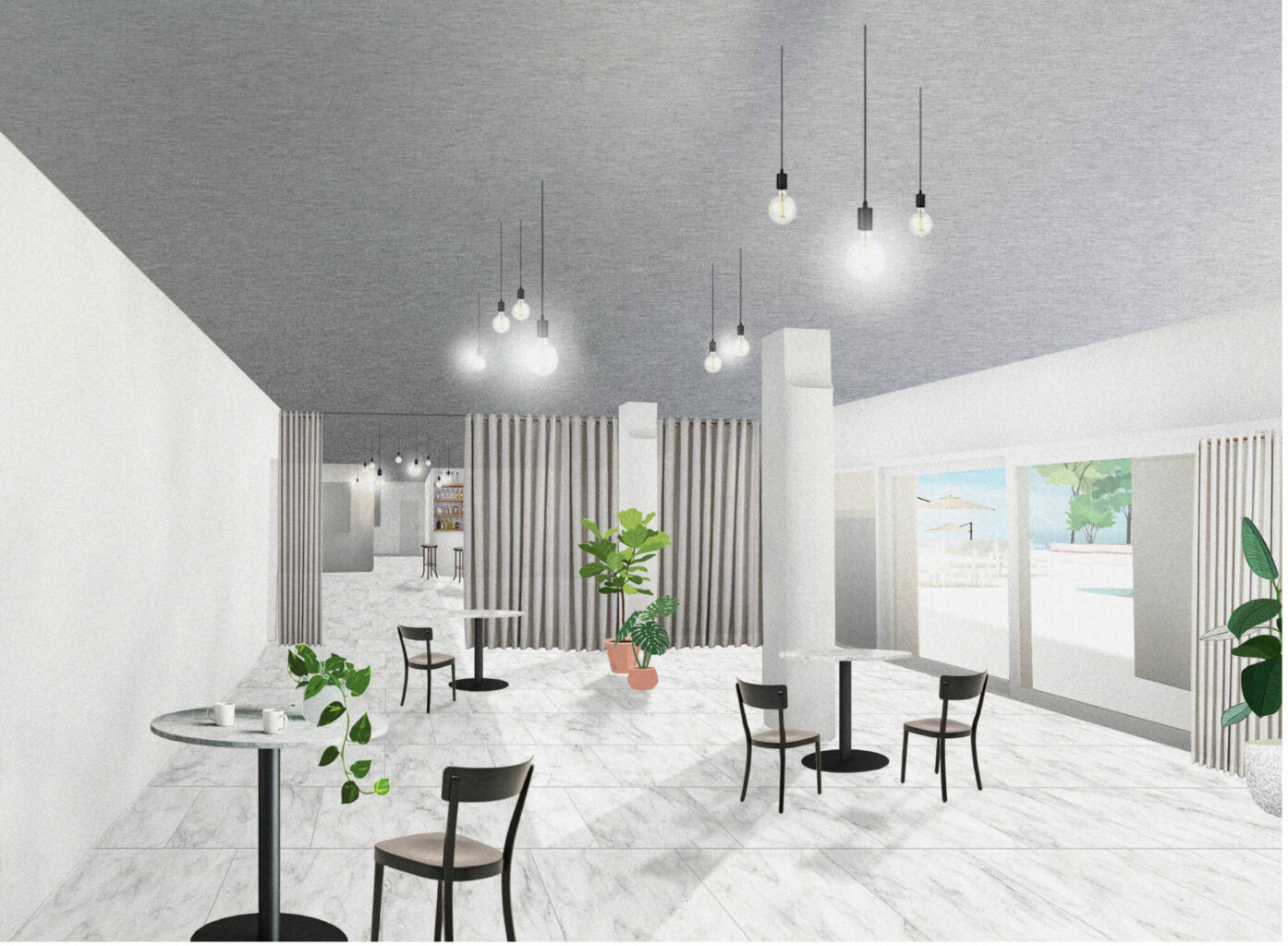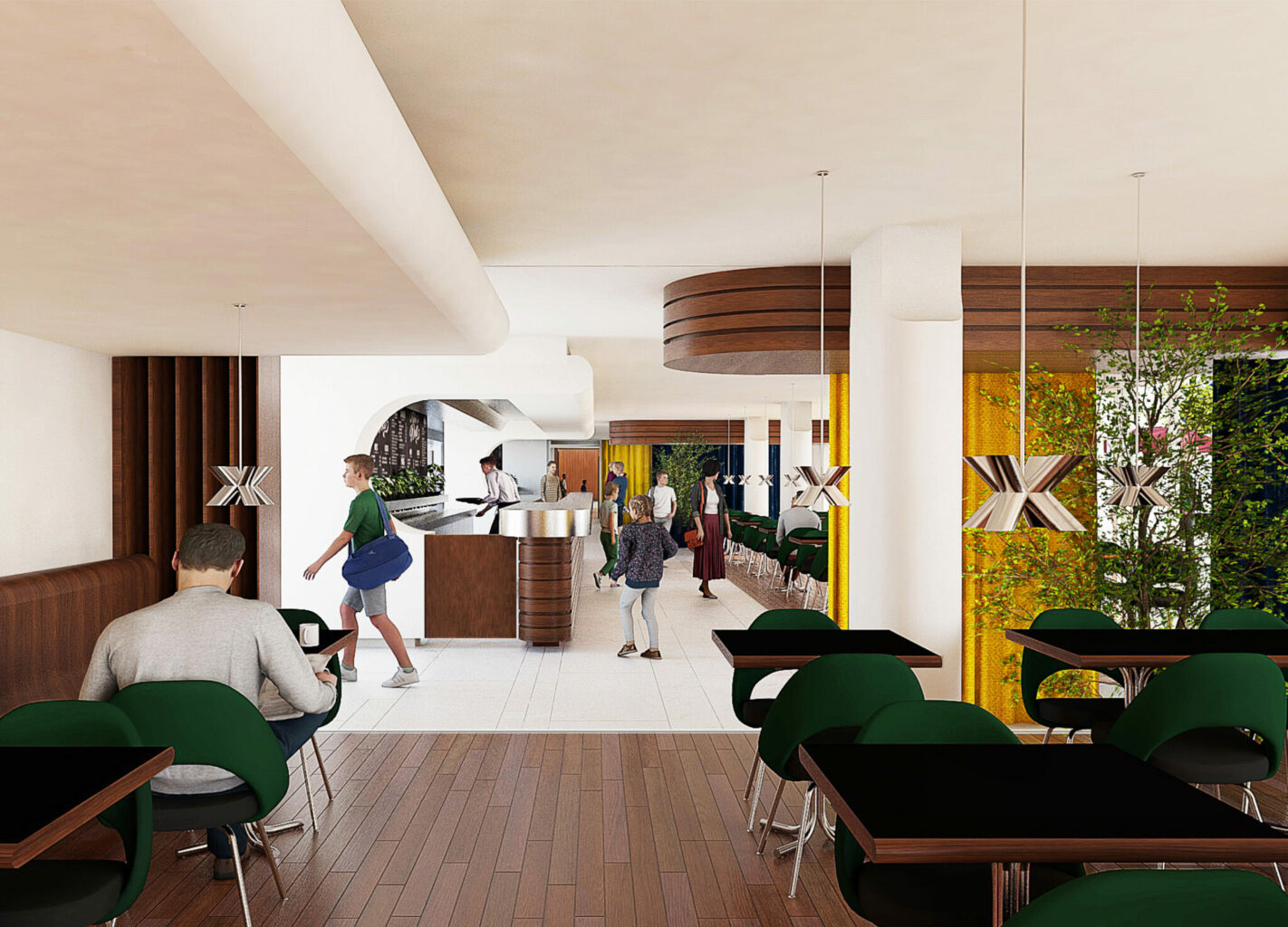 Die Adressierung und Art der Zugänge bleiben in Ihrer Hierarchie erhalten, der Hoteleingang wird neu als Haupteingang zur Musikschule genutzt. Den Kiosk als Schaufenster der Musikschule umzudeuten ist interessant. Der versenkbare Fenstertyp scheint eher etwas forciert, insbesondere da ein flexibleres Öffnungsverhalten im Hinblick auf das Musizieren zur lärmigen Strasse hin mehr Szenarien ermöglichen würde. Geschickt kann die heutige Rezeption als Raum für den Empfang der Musikschule dienen.