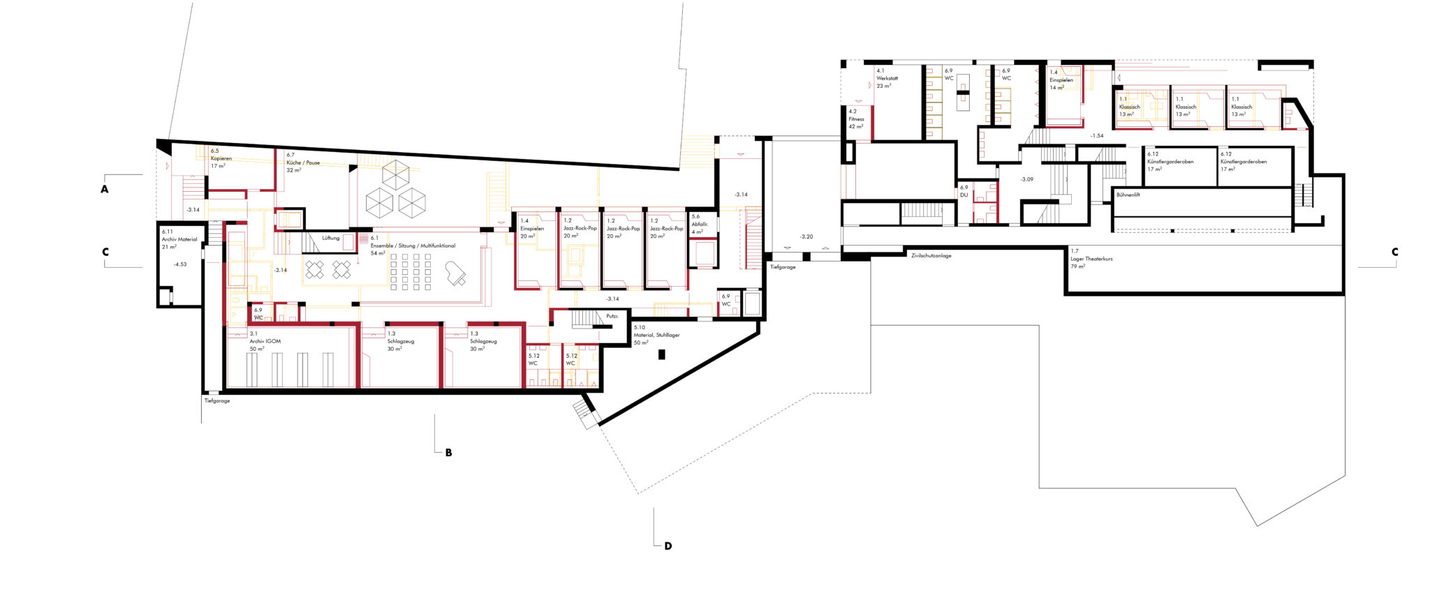 Die Anordnung der Übungsräume im Untergeschoss zum sogenannten Jazzhof erfordern zusätzliche akustische Massnahmen an der Fassade. Der Abtausch von Theaterraum und Übungsräumen könnte das Problem lindern und die Belichtungssituation verbessern, da der Theaterraum nicht immer in Gebrauch ist.