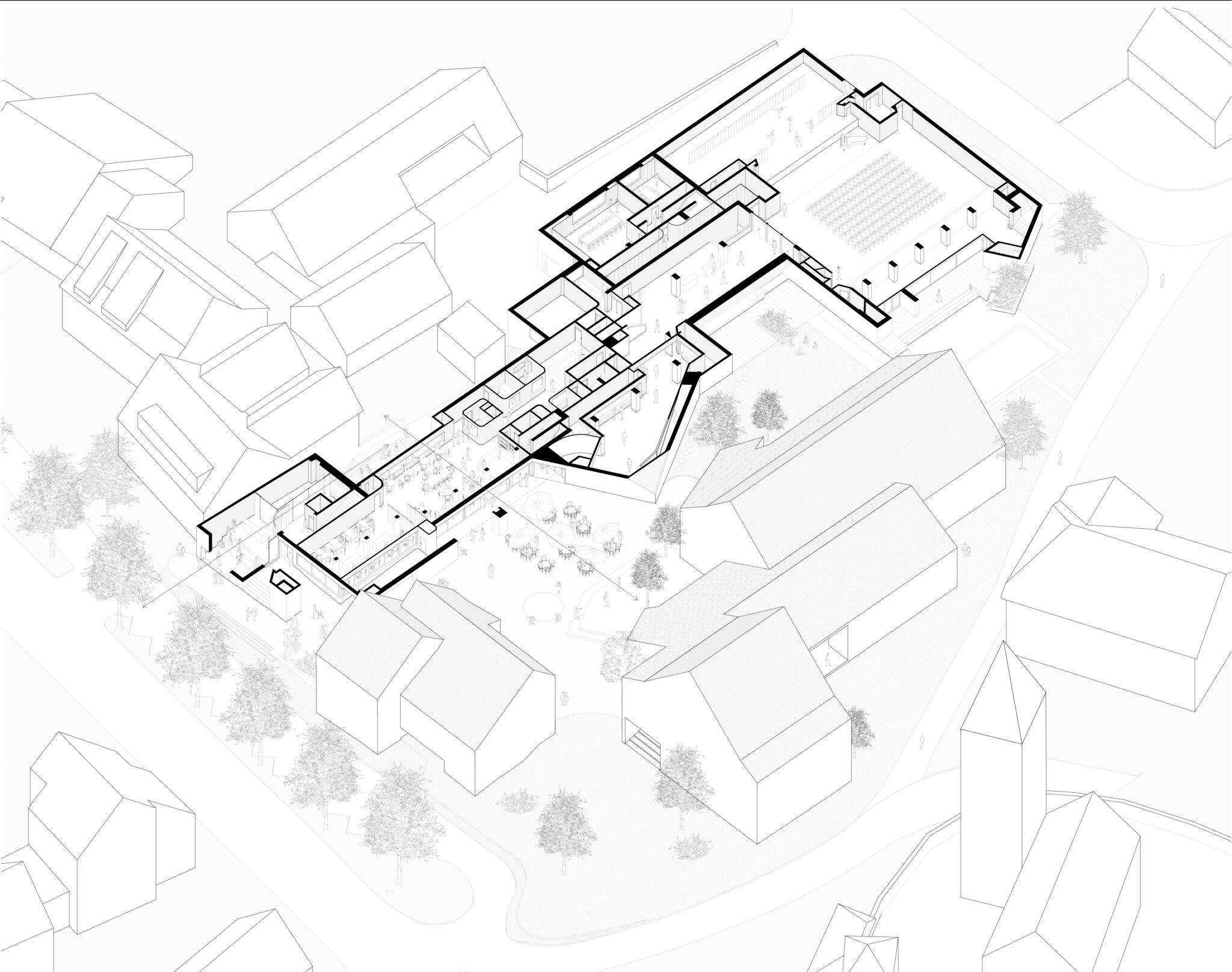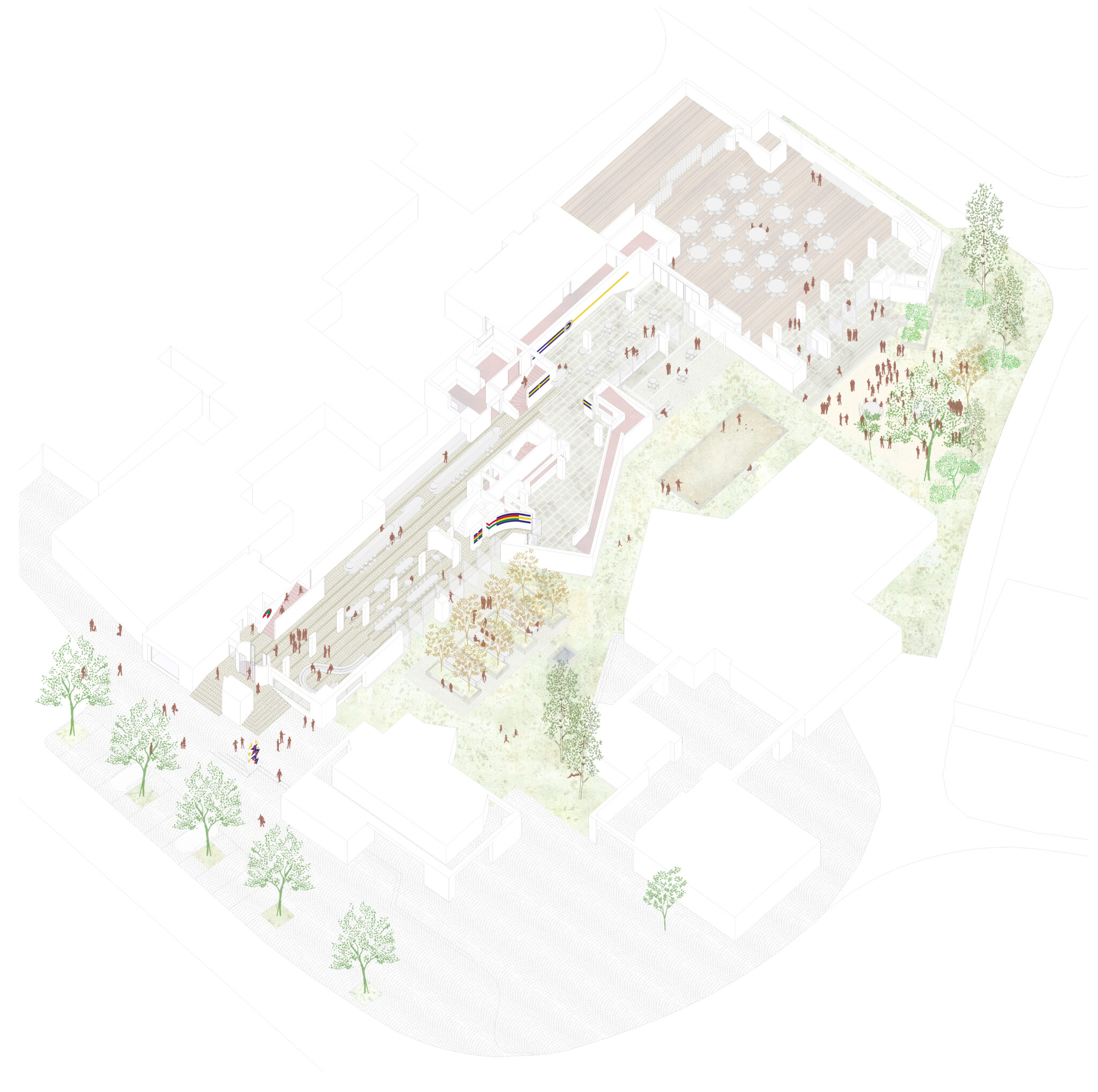 Ausgangspunkt des Entwurfes ist eine sorgfältige Analyse des Kontextes und der ursprünglichen städtebaulichen Idee von Rolf Keller und Fritz Schwarz: die Gruppierung der Gebäude um eine Reihe von Höfen, die Verlagerung der Zugänge in die Tiefe der Parzelle und die damit zusam- menhängenden innenräumlichen Qualitäten: Die eindrückliche Wegführung als «Promenade Architecturale», und die Orientierung der wichtigen Innenräume auf jeweils zugeordnete Höfe.