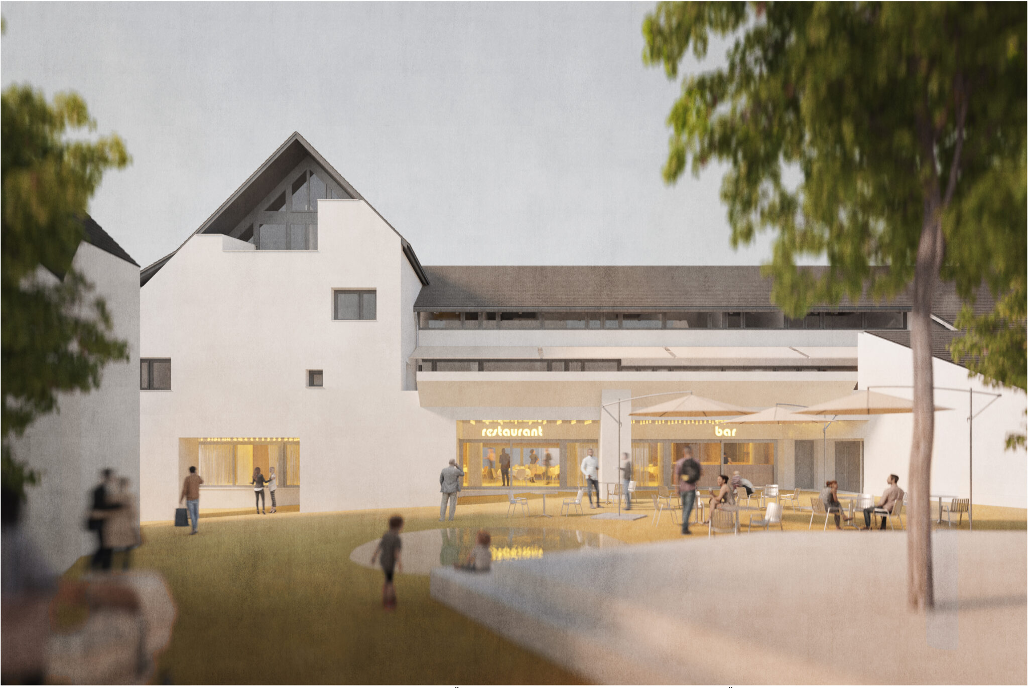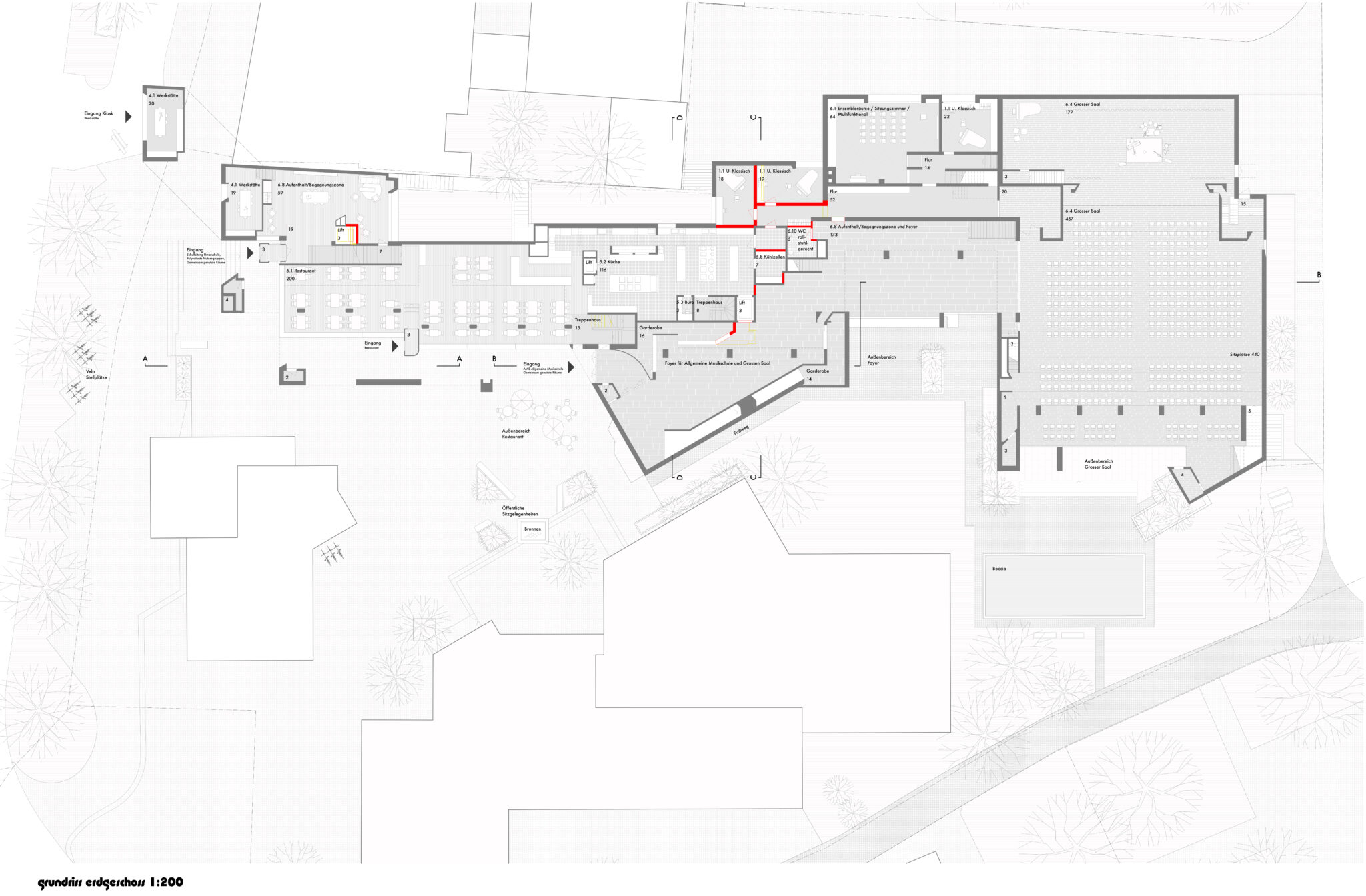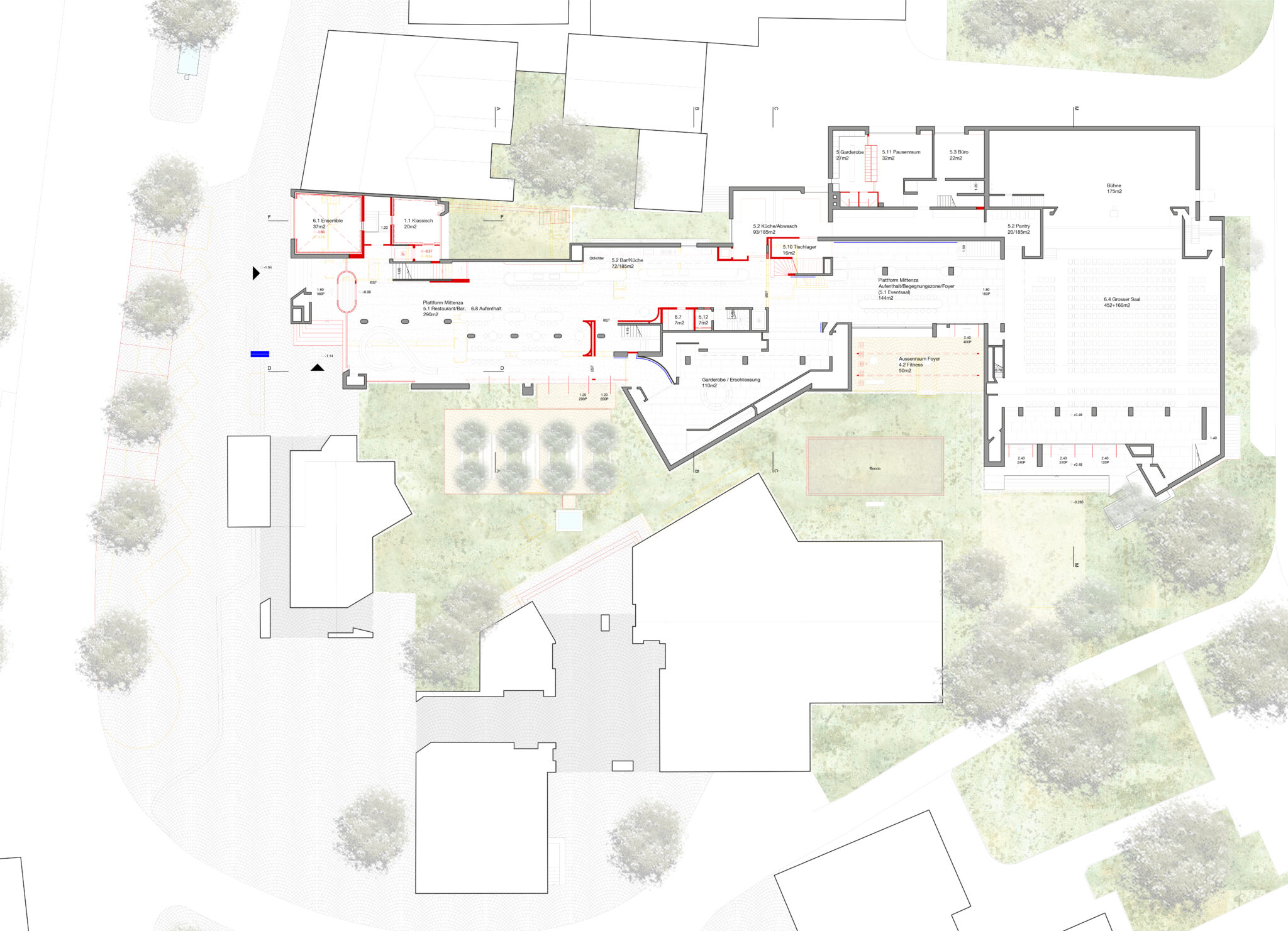 Die Projektverfasser verändern die Zugangssituation in den Gebäudekomplex. Der Zugang zur Musikschule von der Strasse ist schlüssig und grosszügig gestaltet. Die Haupterschliessung über den zentralen Platz in das Foyer und in das Restaurant von der Arkade weicht einer individuel- len Erschliessung des Restaurants und der Säle vom vorderen und hinte- ren Hof. Die Zugangssituation zu den Sälen wird komplett neugestaltet und führt in Verbindung mit einem neuen Vordach zu grossen Eingriffen an der Struktur und im Erscheinungsbild. Ergänzt wird diese Massnahme mit dem Zurücksetzen der Aussenwand des Saals um damit einen gedeckten Aussenraum zu schaffen. Der Zugewinn dieses Bereiches wird mit einer weiteren Veränderung des Erscheinungsbilds erkauft und kann nicht überzeugen.