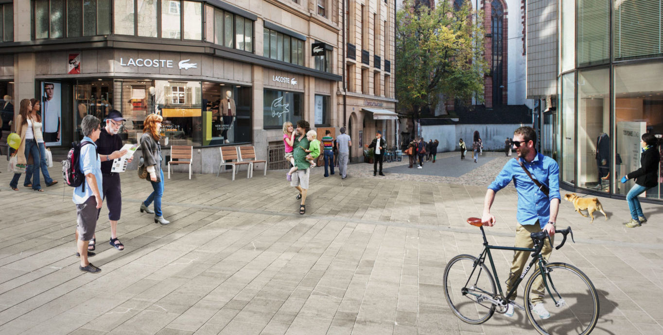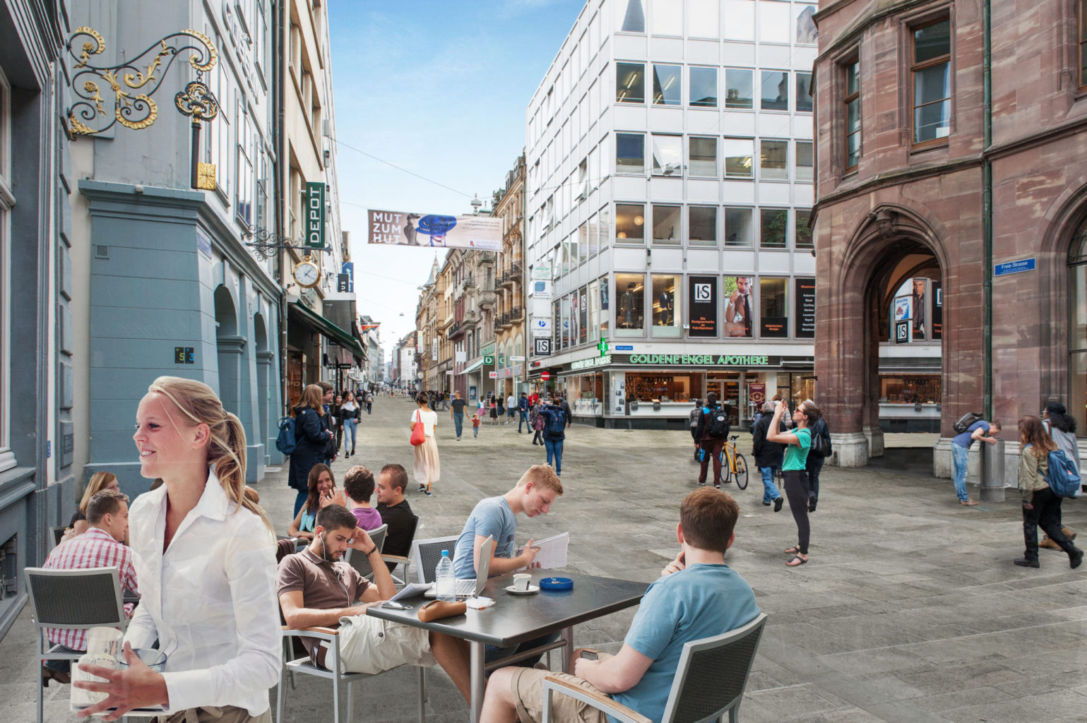 In der Freien Strasse, der Streit- und Rüdengasse entsteht eine grosszügige Flaniermeile: Alle Trottoirränder fallen weg, durchgehende Platten aus Quarzsandstein laden ein "zum ungehinderten Schlendern auf der ganzen Strassenbreite." Grosszügige Flächen können auf ganz unterschiedliche Weise genutzt werden, sei es für Strassencafés, für das tägliche Anliefern von Waren oder für Veranstaltungen wie die Fasnacht. Die Strassenränder der Kaufhaus- und Barfüssergasse werden mit geschliffenen Rheinwacken gepflästert. "Um den historischen Charme der Barfüsserkirche zu betonen, erhält der untere Teil der Barfüssergasse eine durchgehende Pflästerung", schreiben die Projektverfasser. Der Dreizackbrunnen am Fusse des Münsterbergs wird in Anlehnung an seine historische Position um einige Meter in Richtung Freie Strasse versetzt. Er werde zum Mittelpunkt d"er dortigen Aufweitung." Der Baum bei der Bäumleingasse rückt ebenfalls in eine prominentere Position in der Freien Strasse – er wird vom „Strassen-“ zum „Platzbaum“. In der unteren Freien Strasse bei der Rüdengasse bietet künftig ein neuer Trinkbrunnen Erfrischung. Im Zuge der Arbeiten wird auch die bereits vom Grossen Rat beschlossene Polleranlage oben an der Freien Strasse realisiert. Man darf auf das gepflegte Flanieren auf edlem Quarzsandstein gespannt sein.